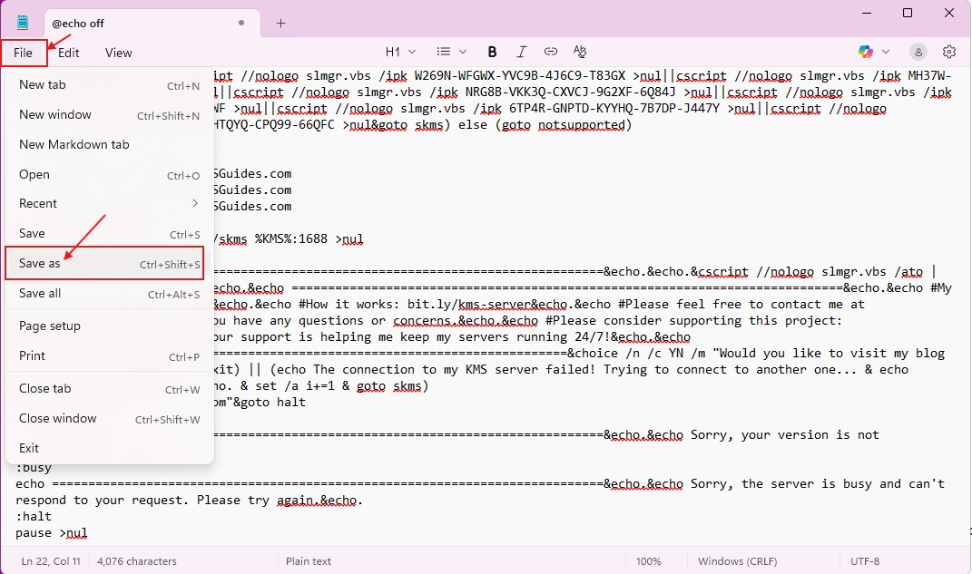 Lưu file văn bản dưới dạng batch script
